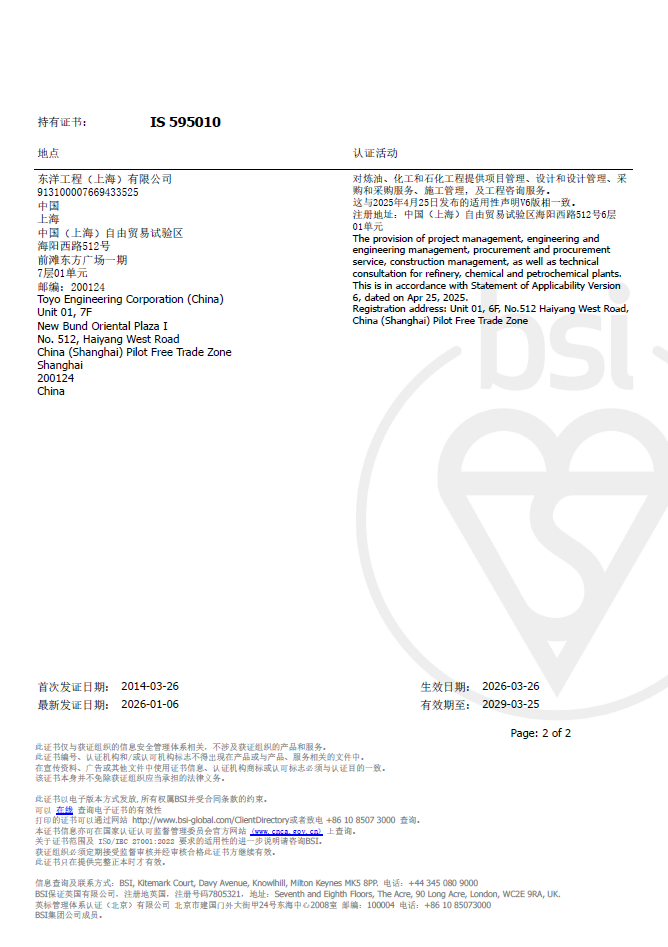 On January 7, 2026, Toyo-China successfully passed the recertification audit of the ISO/IEC 27001 Information Security Management System conducted by BSI (British Standards Institution). This signifies that the company's information security management system continues to meet international standard requirements and the information security governance capability has been recognized.