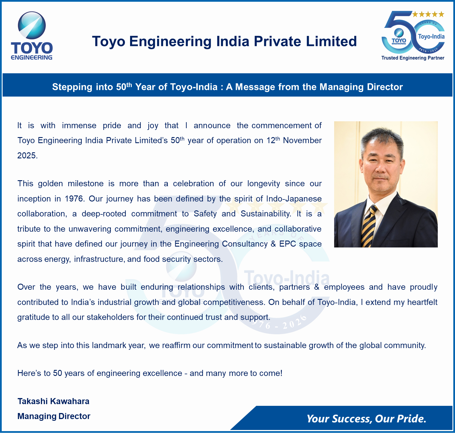 Jan. 13, 2026 | Toyo-India wins order for new Ammonium Nitrate-II (AN-II) Melt Plant at GNFC Bharuch |
