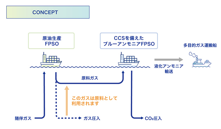 TOYOは、アンモニア製造、FPSO(浮体式海洋石油・ガス生産貯蔵積出設備)およびCCSプロジェクトにおける豊富な経験を活かし、ブルーアンモニアFPSOの実用化に向けた開発を進めています。