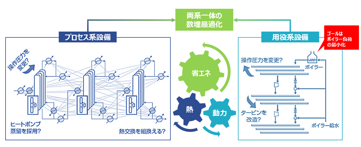 プロセス系で必要とされる熱・動力は用役系、特にその多くがスチーム系から供給されています。そのため、プロセス系における熱・動力利用の高度化を追求すると同時に、それをボイラー負荷の最小化へと結び付けることが不可欠です。