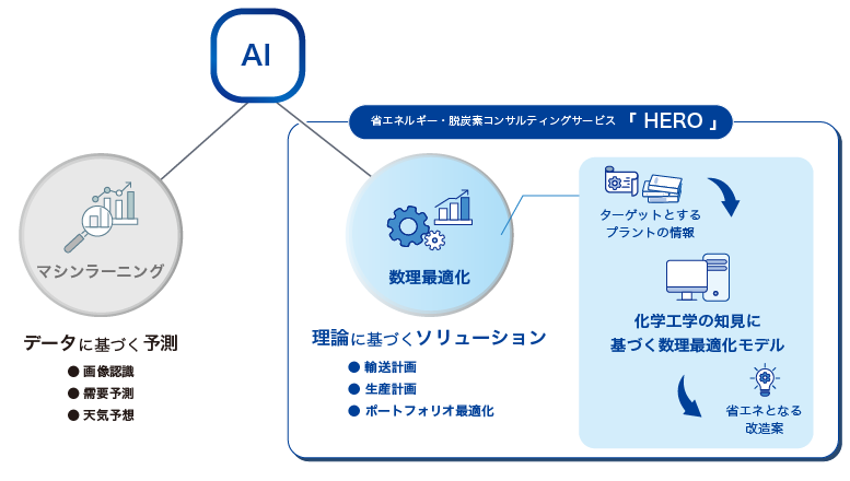 HEROは、近年発展が著しい人工知能(AI)を構成する一分野である数理最適化を、プラントの省エネルギー検討に応用したサービスです。