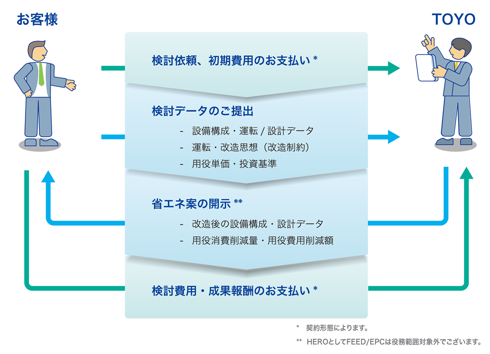 HEROでは、お客様からご提供いただく検討データをもとに、最適な省エネルギー施策案を提供します。具体的には、設備の設計・運転データ、改造に関する制約条件、用役単価などを基に数理最適化計算を実施します。計算結果を検証した後、改造後の設備構成や用役消費削減量などを検討結果として提供します。なお、HEROはFront End Engineering Design(FEED)やEPCは役務範囲対象外とし、ソリューション創出に集中することで、お客様のプロジェクト計画の柔軟性を提供します。