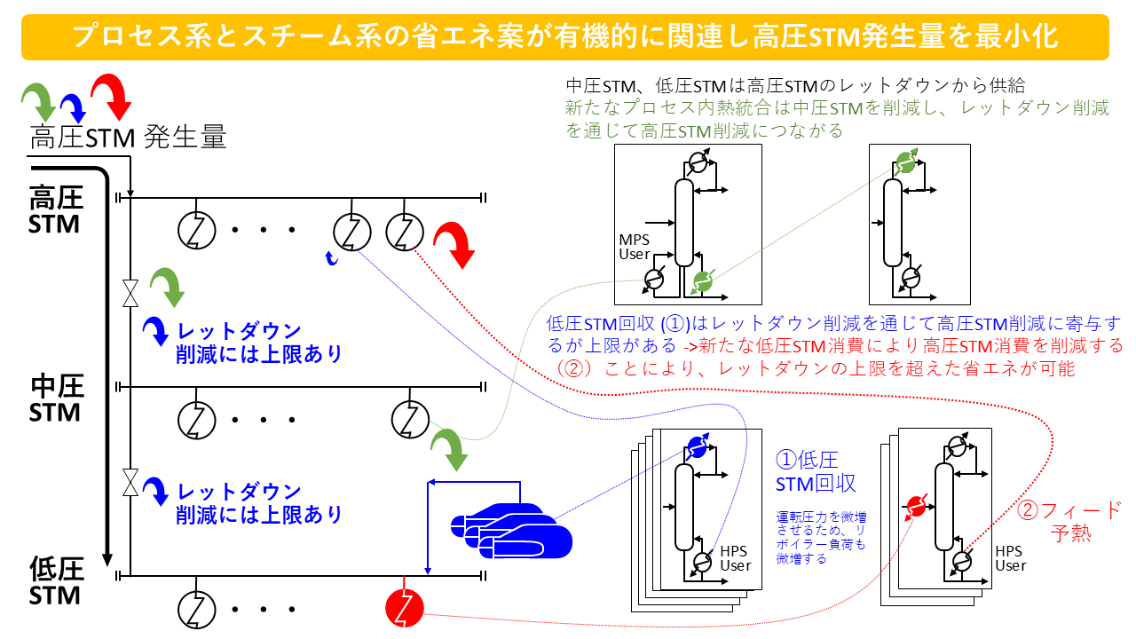 高圧スチーム(STM)・中圧STM・低圧STMの3つのレベルからなるスチーム系を有するプラントにおいて、HEROはスチームバランスを考慮しながら、プロセス熱統合(緑色)、蒸留塔の運転条件変更(青色①、赤色②)を同時に検討します。従来手法では、プロセス系とスチーム系を段階的に分離して検討するため、このような相互依存関係を前提とした統合的な設計は困難でした。