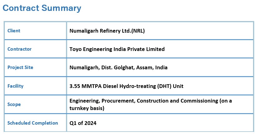 Toyo Engineering India Pvt. Ltd. (Toyo India) has been awarded a contract by Numaligarh Refinery Ltd. (NRL) for the Engineering, Procurement, Construction and Commissioning (EPCC) of a 3.55 MMTPA Diesel Hydro-treating (DHT) Unit at Numaligarh, District Golaghat in Assam state of India.