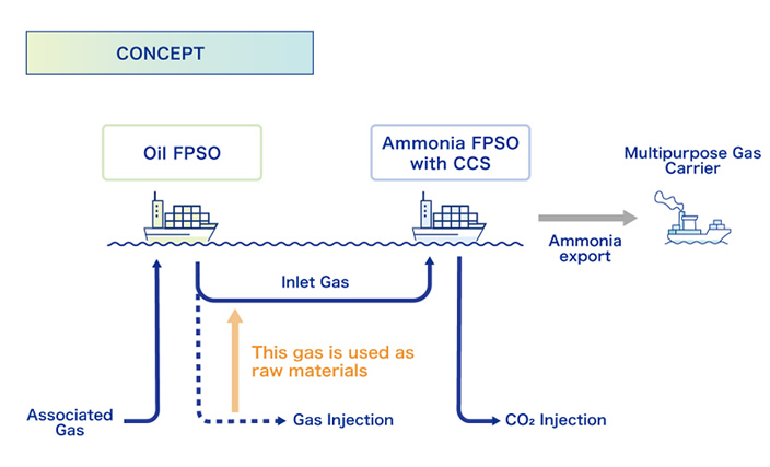 Blue Ammonia FPSO is an offshore plant to be installed adjacent to oil FPSO that produces crude oil. It converts associated gas, which is generated at oil FPSO, into blue ammonia. The CO₂ generated during the production process is captured and reinjected into the oil reservoir. By producing ammonia offshore rather than onshore, the system enables the effective utilization of associated gas which is reinjected into oil fields in most cases without being fully harnessed by converting it into ammonia. In addition, similar to oil FPSO, Blue Ammonia FPSO can be relocated and deployed to new offshore areas as required. This allows for flexible operations in accordance with demand and resource conditions.