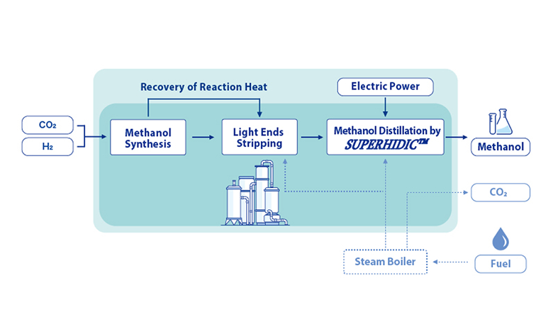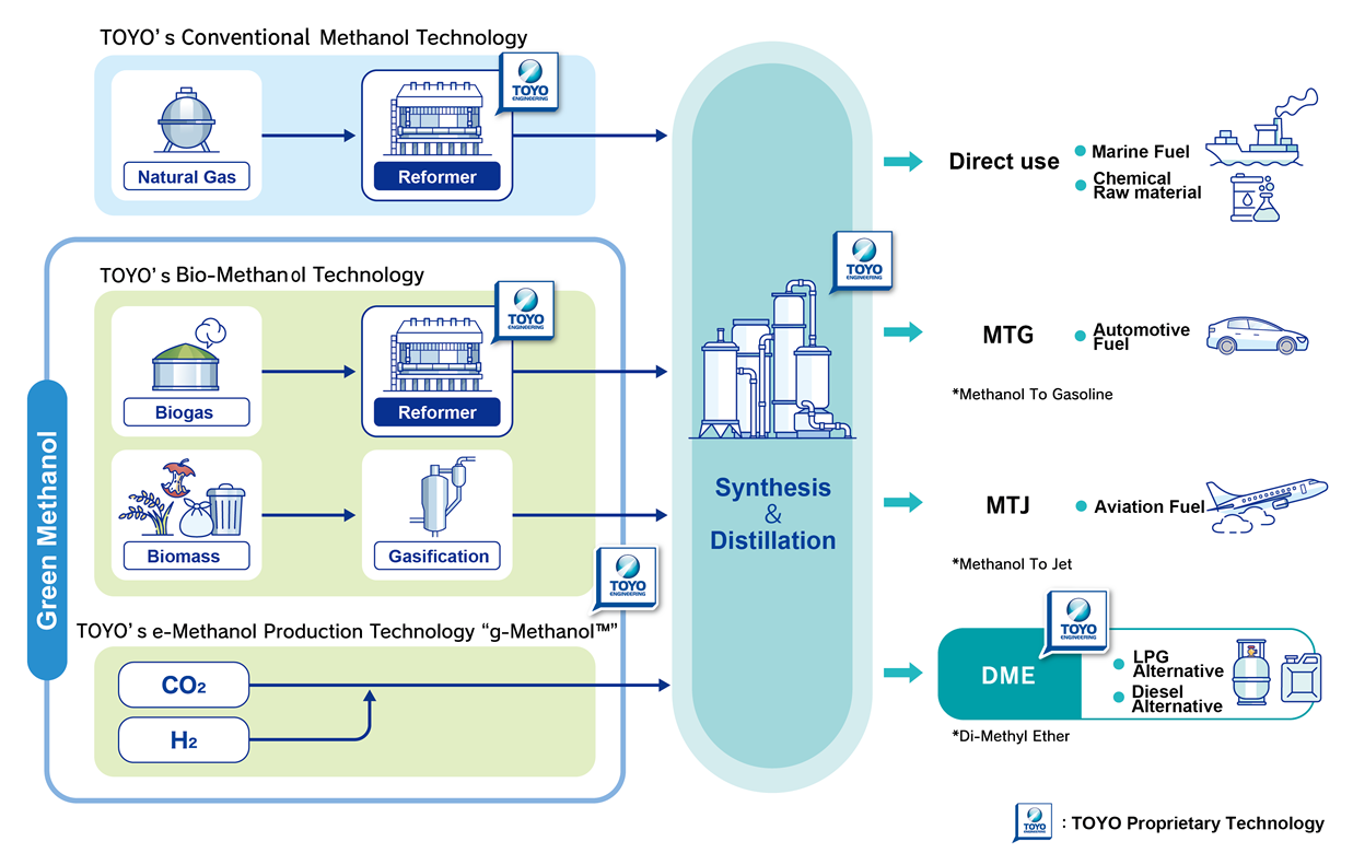 The g-Methanol™ technology is TOYO’s proprietary process for producing e-methanol using hydrogen derived from renewable energy and CO2 captured from various emission sources.