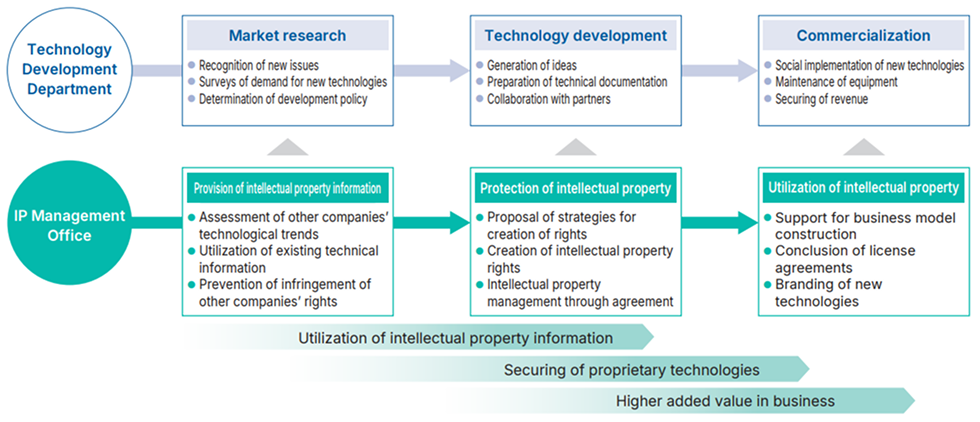At TOYO, the IP Management Office, our intellectual property division, leads the creation and protection of intellectual property, the planning and execution of IP strategies, and the development of co creation* business models through front end activities in collaboration with the Technology Strategy Committee and R&D divisions, spanning from the formulation of technology development policies through to commercialization.