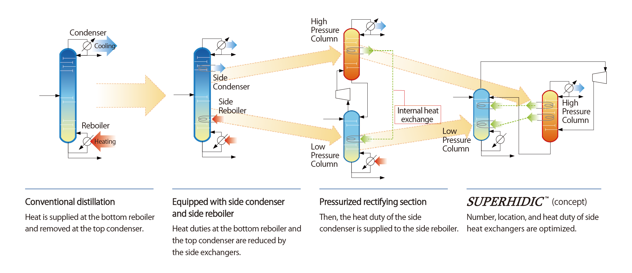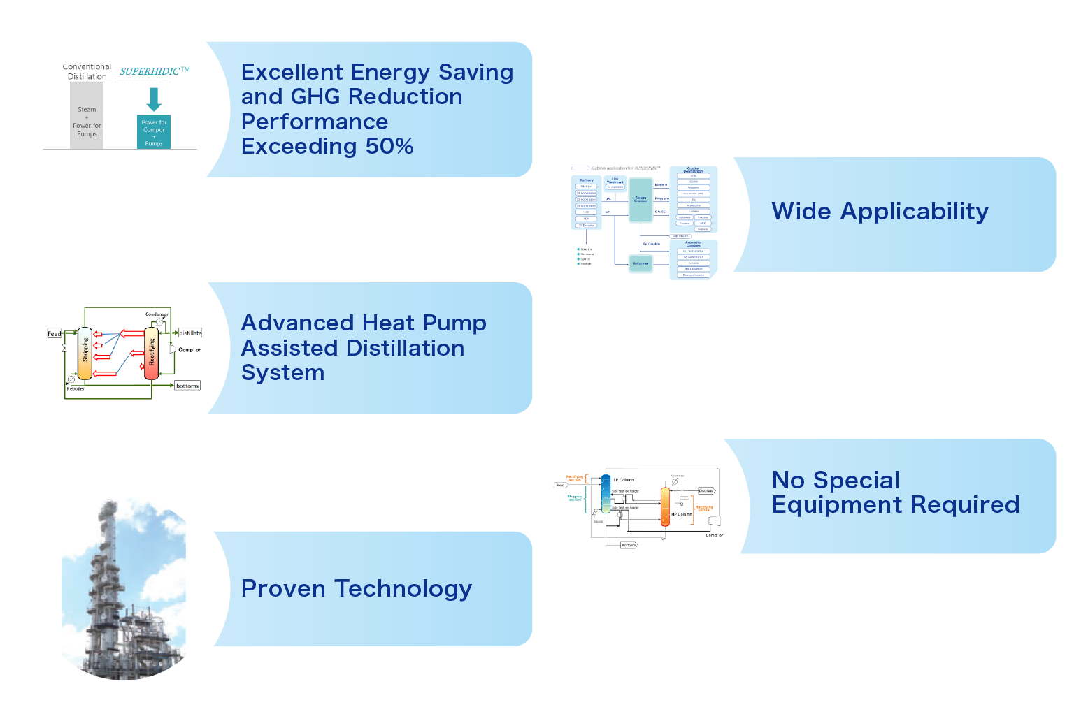 SUPERHIDIC ™ is a kind of heat pump assisted distillation system that operates without external heat sources such as steam or fired heaters. It achieves an excellent energy saving and greenhouse-gas (GHG) reduction above 50% compared with conventional distillation system in various industrial applications.