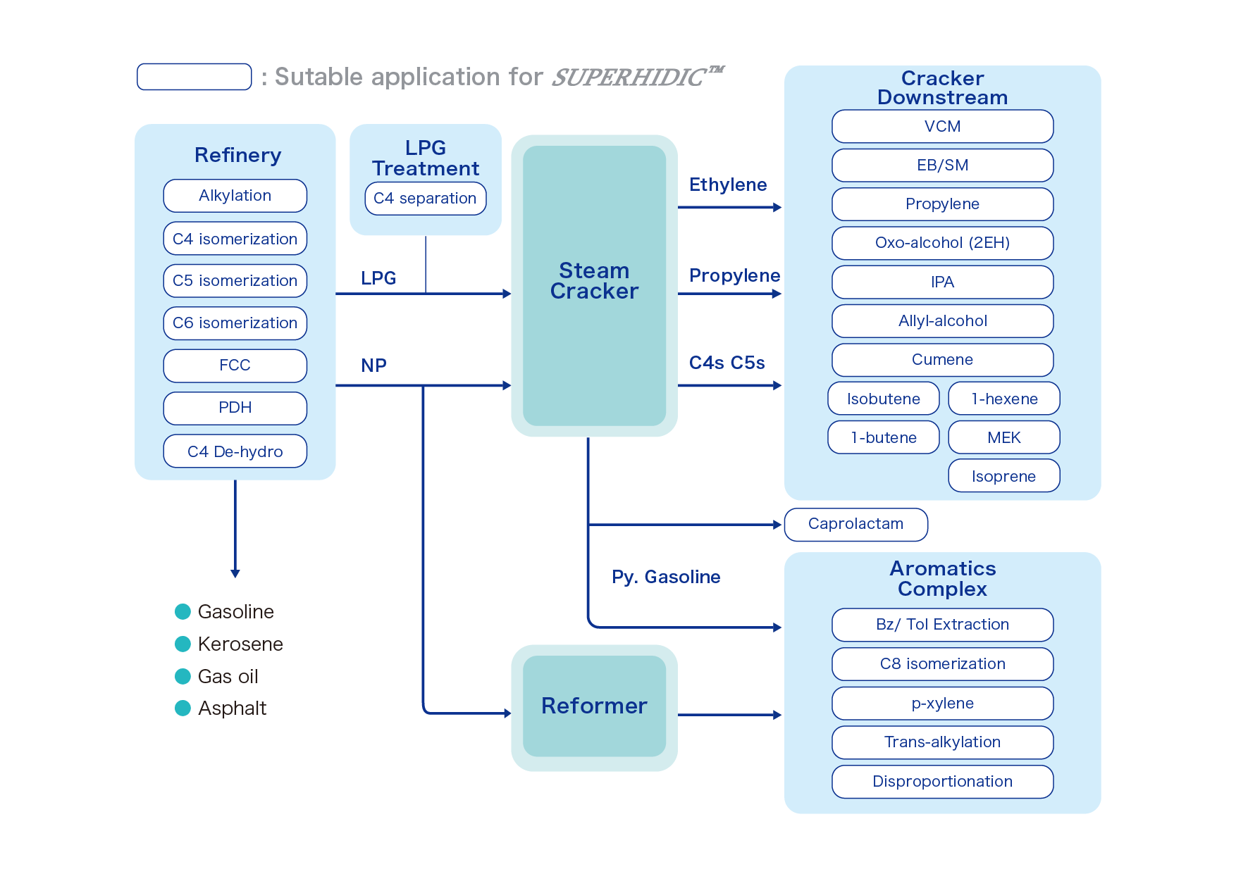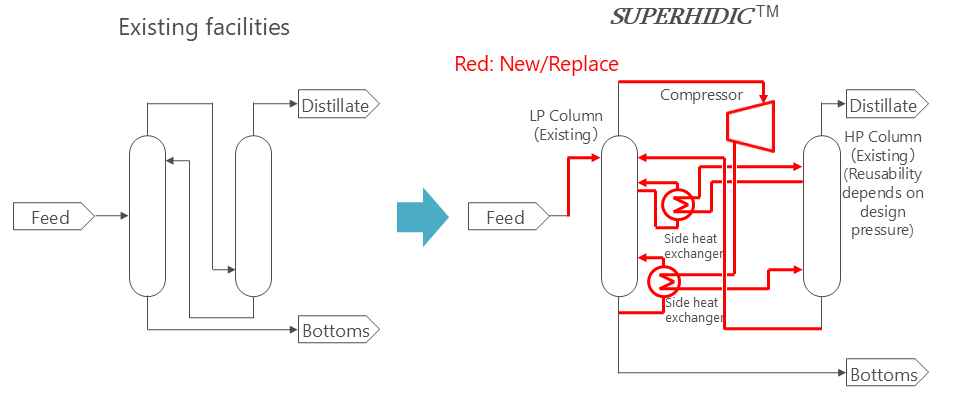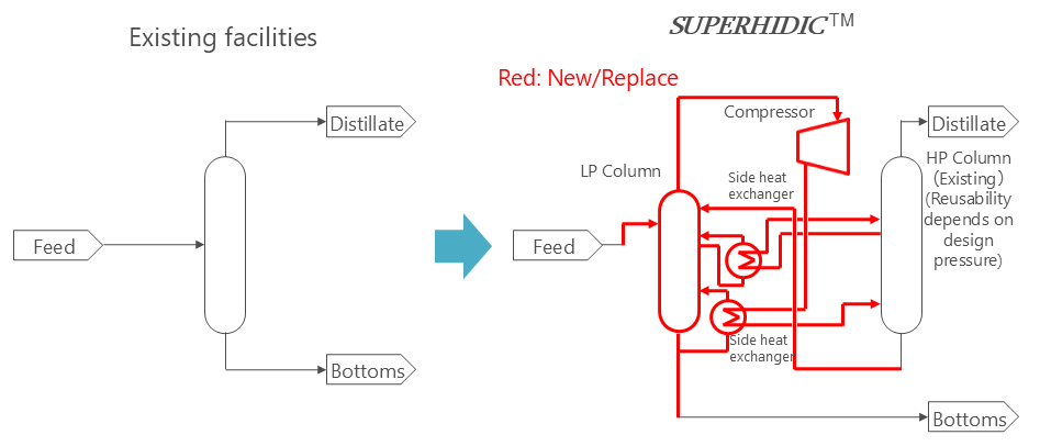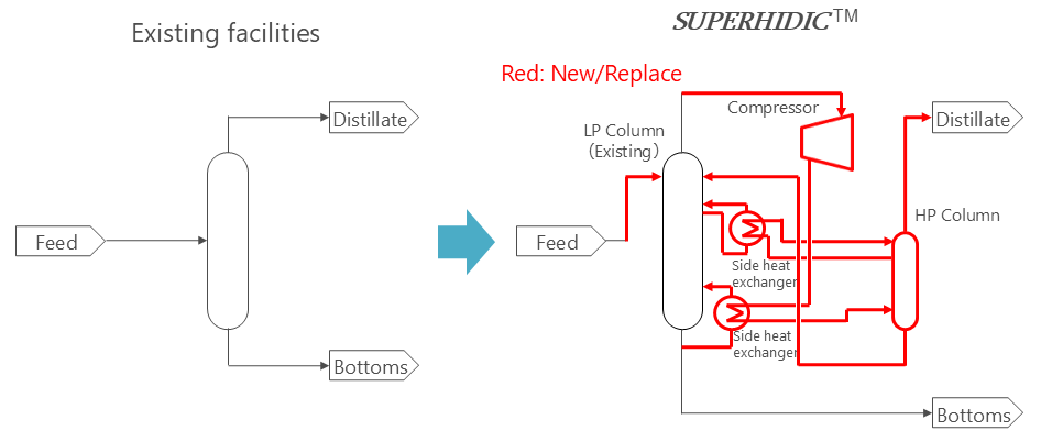 In the previous application, the existing facilities were replaced with the new facilities. However, as a result of the technology development, existing distillation column and its auxiliary facilities can be re-used as configuration of SUPERHIDIC ™ system in maintaining excellent energy efficiency.
