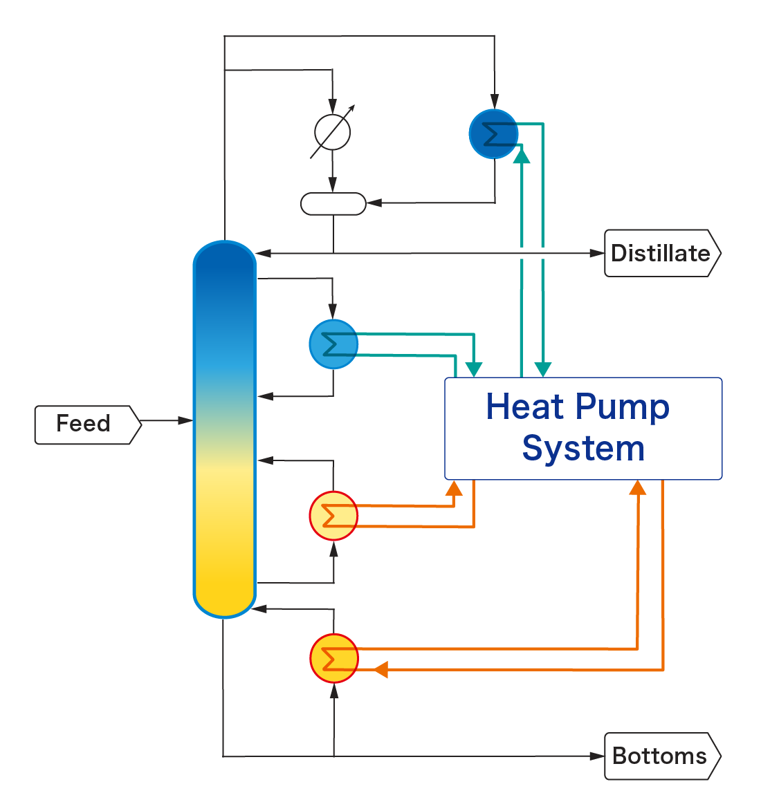 In systems where operating pressure/temperature of distillation column are limited, the above concept can be realized by combining SUPERHIDIC ™ technology with indirect heat pump cycles. Although indirect heat pump system are less energy‑efficient than direct ones, TOYO has developed patented technologies enabling energy savings without changing existing column operating pressure. This is especially useful for deep‑vacuum systems and heat-sensitive processes.
