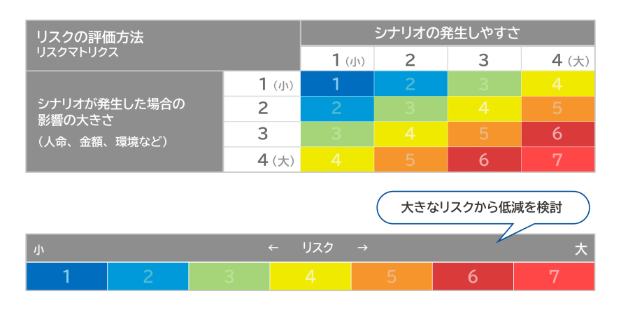 それぞれのリスクシナリオの発生確率と発生時の影響度を数値化してマトリックスに落とし込み、リスクの大小を可視化することで、対策実施の優先付けも行っています。