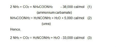 実質的に産業的適用のために(3)番式に従い、反応器でアンモニア/二酸化炭素分子の割合を2.9〜4.1に合わせて運転して尿素生成を促進します。その結果、合成結果物は尿素、余分なアンモニア、カルバミン酸アンモニウムと水分が含まれています。