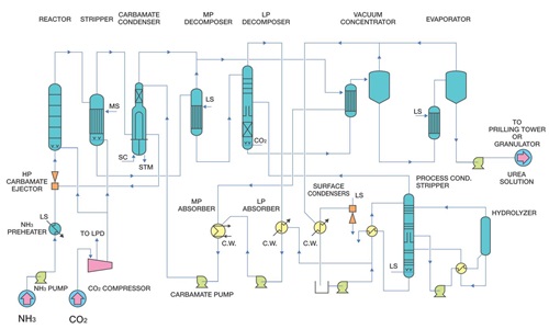 したがって、最終的な製品である尿素を取得するために、アンモニアを分離し、切り替わっていないカルバミン酸アンモニウムを分解し、水分を蒸発させる過程が必要です。
