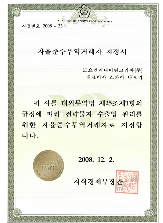 東洋エンジニアリングコリアは、知識経済部から12月2日付けで対外貿易法第25条1項に従い、戦略物資輸出入管理のための自律遵守貿易取引者に指定されましたが、これは国内プラントエンジニアリング業者としては最初に指定されたものです。