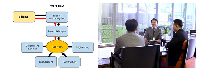 例えば、韓国で初めてプラント事業を手がけるお客様の場合、韓国法令や規則等に基づき、許認可事項を含むマスタープランを作る必要があり、そのためには、あらゆる技術力を含む数多くの経験に裏付けされた知識を備えた専門家の支援が必要です。それだけではなく、最初に事業を行いながら体験する様々な官公庁やパートナー業者との交渉過程でも専門家の支援が必要となります。