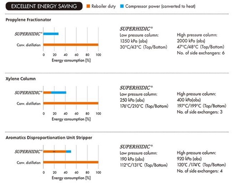TOYO에서 개발 한 SUPERHIDIC은 다양한 산업 분야에서 기존의 증류 시스템에 비해 50 % 이상의 우수한 에너지 절감 효과를 제공합니다. SUPERHIDIC은 특수 장비를 사용하지 않고 증류 및 열 전달과 같은 입증 된 기술을 적용하여 매력적인 경제성을 제공합니다. 또한 SUPERHIDIC으로 유지 보수성을 높일 수 있습니다.