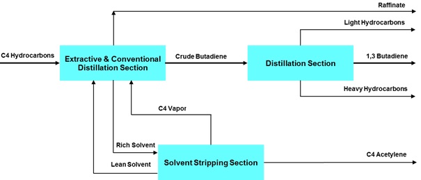 부타디엔 추출 공정은 mixed C4 탄화수소 혼합물에서 solvent를 이용하여 Crude 1,3-부타디엔과 Raffinate를 분리하도록 설계됩니다. 추출 공정은 Extractive and Conventional distillations, Solvent Stripping Section and Distillation Section 으로 구성되어 있습니다.