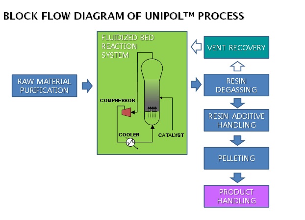 UNIPOL™은 단위체 (에틸렌 또는 프로필렌)를 유동층 반응기 내에서 중합하는 것을 특징으로 하고 있으며, 가스 상태에서 co-monomer 및 수소와 함께 촉매에 의한 중합 반응을 하게 됩니다. 반응기 내에서 고체 중합체 입자가 생성되고 가스흐름에 의하여 유동화 됩니다. 반응기 내부에는 어떠한 동력기계 장치나 cyclone과 같은 분리 장치가 설치되어 있지 않으며, 이러한 특징으로 인해 건설 비용이 낮고 생산공정의 신뢰성이 획기적으로 높습니다.